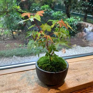 農協の販売所で売ってたモミジ🍁 細かい種類はわかりませんが 連れて帰って 瓦色の鉢に植え替えました😊 苔を敷いて メネデールをあげました 根付いて真っ赤に紅葉してほしいなー