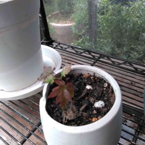 駐車場にどこかから飛んできた種で 芽吹いたらしいモミジ。 鉢植えにしました。赤葉みたいです。
