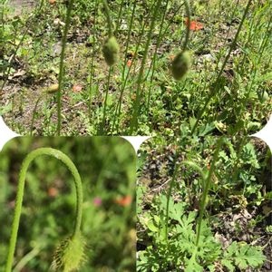 2枚前のケシ科の花の確認。 葉の出方と形は、ナガミヒナゲシの特徴に近い。茎には剛毛とまでは行かないが、毛は生えている。 実の形はさほど長くはないが、これから成熟したら細長くなるのか? 八割がた、ナガミヒナゲシ(長実雛芥子)だと思う。 ♯900