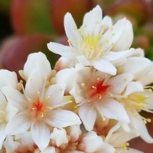 こんにちは☀️ 赤茶色に紅葉した葉 艶々プリプリ~ 少し緑色になりつつ 可愛いお花が咲きました 白い花びらに雌しべがルビー色で可愛い