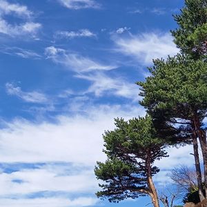 近くを散歩…見上げたら絶景~🍀 お寺の境内で写真下は墓地です💦 青空と雲と松の木、思わずパシャリ📷