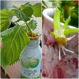 青じそ 挿し芽用に分けてもらった枝で 水栽培を始めました。 5日でこんなに根が伸びました😃 生命力に感服🌱🌱🌱