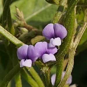 ツルマメ マメ科ダイズ属の一年草のつる植物 別名: ノマメ ダイズの原種とされる。 花期: 7-9月 葉腋から房状花序を出して、長さ6 mm前後の蝶形をした赤紫色の花が3個か4個つき、稀に白い花の場合も有る。萼はツリガネ形で5裂し、黄褐色の細かい毛が密生する。 花は2枚の花弁と、それより小さい2枚の淡紫色の花弁からなる。 花弁のうち旗弁の中央部分は、凹んだ形状をしている。 雄しべは10本で、下側の9本が下部で癒着して一体となる。