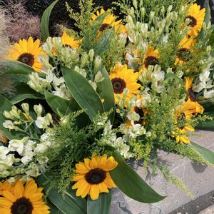 近所の神社の花手水舎 ミニ向日葵のアレンジに変わってました🌻