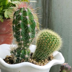 サボテン 2連チャン やはり夏はサボテンですね。 あとクロトンとかネペンテスとかソテツとか、夏に元気な子に目が行きます。 サボテンとユーフォルビアの詰め合わせの内のふたり。 2枚目はお迎え時です。 ついでに手前に見切れてるのは墨こけしです、こちらも元気💪🏻 名もなきサボテン、左は武倫柱かな? 右はお迎え時は真っ平らだった頭が丸く膨らんできている😂🎈 丸くなる子?伸びる子?