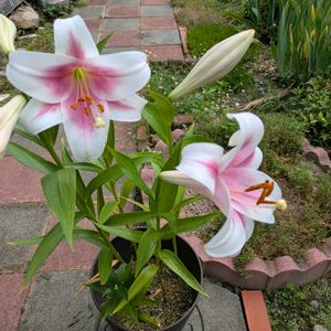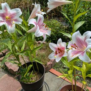 【ちょっと訂正】 花粉が赤いほうはカサブランカ系かも❓️ 朝はかなり早起きしないと 充分な水やり出来なくて夜に集中しがち💦 ①②③テッポウユリとカサブランカ 鉢に植えっ放し2年目 地植えの株より 鉢植えの方が 早く咲き始めました🎵 いい香り〜💓