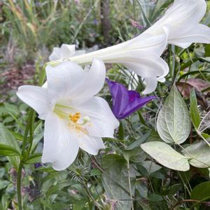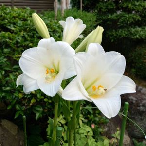 帰宅したら テッポウユリが咲きすぎて 鉢植えのが隣のバラに 倒れかかってました💦 バラが折れてなくてよかった😓 花粉がたくさん付いてたユリを 少し切りましたが いい香りがして庭にいるのが楽しいです ノリウツギ(たぶん)も 蕾が大きくなってきました