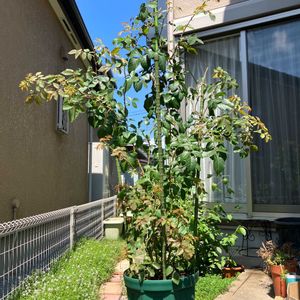 こんにちは。今日は休みっ!笑 今日は朝に娘氏を駅まで送って、すぐに猛暑の前にバラの鉢増し。 新苗購入日に6号鉢に植え替えてちょうど1ヶ月半、今回は8号鉢に鉢増しです。 植え替え中の根の様子とかも撮りたかったけど、バラの負担を考えてスピード勝負で終わらせちゃった。しっかりと根鉢ができていましたよ。 1mを超え、枝葉は茂り、ベーサルもニョキニョキ。風で倒れたりと、ちょっと鉢が小さく感じていたので、冬の地植えまでこの鉢で更に大きくなってもらいましょう。 しかし、8号ロングは大きいですねw 見た目と安定感がスゴい。笑 で、空いた6号鉢にはミニバラを植え替え。同じ6号の根張り鉢は土の量が少ないのが夏に向けて気になっていたので、ロング鉢にアップグレード。少しは水切れ予防になれば良いけれど...。