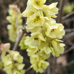 トサミズキ(土佐水木) マンサク科 トサミズキ属 3~4月 2~4m 在来種(日本固有種) 葉が展開する前に開花します ひとつの花序につく花は7~10個 雄しべは5個で葯は暗赤色