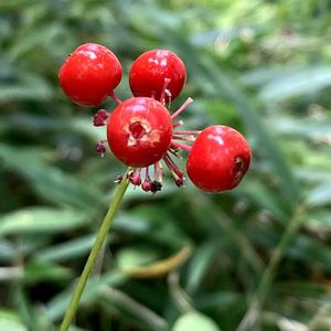 6月にトチバニンジンのお花を見つけた場所へ、実が色付いているか見に行ってきました。 ありました可愛い真っ赤な実、緑の中にツヤツヤの実が輝いていました…✨💕🌿 ⑤6月に咲いていたお花と蕾…❀✨❉ 八ヶ岳1400mの沢沿いにて…2025.8.9 その1
