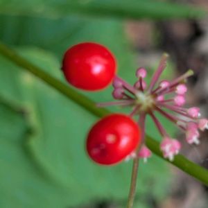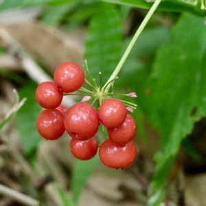 こんにちは😊 今日2枚目は初めて出会え感激の目玉オヤジ🔴⚫🔴 じゃなくてトチバニンジン🔴 別名-竹節人参 ①真っ赤に熟した実で 先端が黒い子は↑ ソウシシヨウニンジン(想思子様人参)と呼ばれるそう🔴 ②花柱が残りVサインする子も ③こちらは実の赤ちゃんと青い実と赤い実で賑やか🟢🔴⚫ ④一本の長い花茎に球状の散形花序(傘形花序)が付き沢山の花が咲き実になります🔴 ⑤全体こんな感じで葉っぱが栃の木に似てるのが名前の由来 🏷️日曜ビタミンカラー♪ 🏷️赤い実 🏷️山野草マニア 昨日の御岳山で🏕️