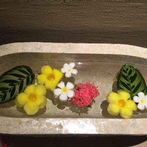 客室の水盤に庭から積んだ花と葉で装飾✨ 🌺🌺🌻🌻🌺🌺🌴🌴🍧🍰🍡 本日は、アラマンダ、シンガポールプルメリア、サンタンカピンク、カラテア・マコヤナを浮かべてみました。🏄 いつも気分次第なのでこれがいいのか悪いのか?わかりません😁