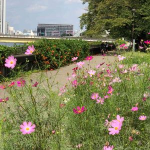 隅田川沿いの遊歩道にコスモスの花がいっぱい咲いています。自転車を止めて休憩です! 反対側にはノウゼンカズラ! 風を切って走るととても気持ちが良いです❣️