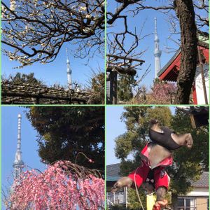 亀戸天神梅まつり スカイツリーと梅! 広場ではお猿さんに拍手喝采👏👏👏 盛り上がっていました。