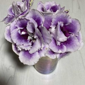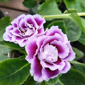 こんばんは~😃🌃 💜🤍八重咲きグロキシニア🤍💜 和名 オオイワギリソウ(大岩桐草) ツートンカラーで八重は豪華❇️ 多年草ですが、 冬越え出来るかなぁ…🤔 ➀②はポーチュラカとハイビスカスとのコラボ~♪