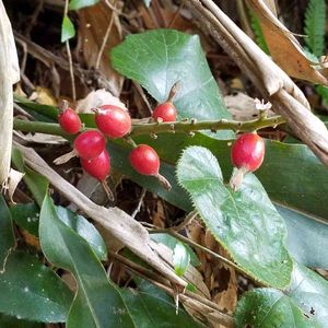 どなたか謎を解いてください。 まわりには、ヤブミョウガが生えていました。 この赤い実を見て、ヤブミョウガの実だと思いました。 けれども、検索してみると、ヤブミョウガの実は赤くないようです。 それでは、この実は何でしょうか💦 リンドウの実のようにも思えますが、この実は、必ずヤブミョウガの株のあるところに見られました。 続いてもう一枚、参考になりそうな写真を投稿させていただきます。 奥三河 1月末 標高500m