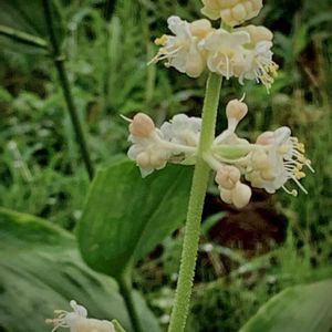 山奥自宅周囲を徘徊中 雨の山奥 覆われた樹木で濡れずに咲いて 新緑の中、すぐに見付かるヤブミョウガ