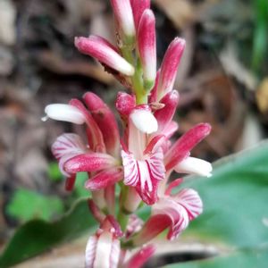 おはようございます👋 ハナミョウガです。 実家の木陰で沢山咲いてるのを 見つけました💕 葉茎はミョウガに似てますが 花は全然違って赤と白が 混ざったような変わったお花です❤️