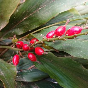 ハナミョウガ(花茗荷)ショウガ科 茗荷(みょうが)のような 大きな葉っぱと長く伸びた花茎に小さいピンク色の花が下から咲いて、その後にできた緑の実からこんなに赤くなったみたいです。 お花も見てみたい。 葛城山にて