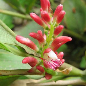 赤い蕾のハナミョウガ、花は白に赤い筋模様があります。 茎や葉がミョウガに似ていて、花が美しいのでこの名前が付きました。 秋には可愛い赤い実が沢山付きます。 花径 1cm位の唇形 草丈 40cm〜60cm位 沖縄の美しいゲットウもショウガ科ハナミョウガ属で仲間です。 種は健胃整腸剤になります。 関東から西に生息します。 ショウガ科 ハナミョウガ属