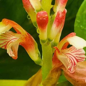 緑に囲まれて艶やかな花なのにあまり目立たないハナミョウガの花 歌舞伎の隈取りのようなマンドリルの鼻模様のような花弁がすごいです🤗