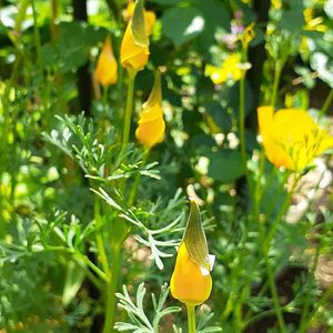 マイガーデン🌼 今日の庭から~ カリフォルニアポピー の つぼみ💕 とんがりボウシがかわいい😊