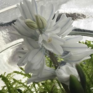 🧄プスキニアリバノチカが 咲きました🤍🍃 茎が殆ど伸びず 球根から直接咲いたような姿だけれ ど 水色🩵の細〜い線がスッと入った このプスキニアが大好きです 春、花壇で咲く姿も可愛いけれど あまりに小さく他の植物に埋もれてしまいそうだから 室内で蕾の膨らむ様子をじっくりと 楽しめる水栽培がお気に入りです 苔🦠のお布団に🧄🧄🧄 咲いたのは1つだけ あとのは小さな🌱が出たまま全く成長してません 簡単そうでて、まだまだわからないことが多い球根の水栽培ですが 寒い冬の間の一番癒しの存在です pic③は釣鐘草シラーの🧄 こちらはキッチン出窓に… 隣にチラッと見える葉っぱは 野バラの新芽 赤い実の野バラを瓶に刺していたら 真っ白な根がドンドン伸びて葉が出てきました 旺盛な生命力にびっくり🫢 春になったら庭に植えます