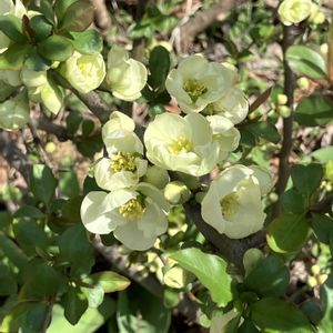 花ボケの白い花、今年は、少し緑ぽい花になりました。‼️