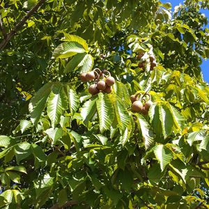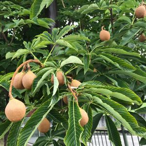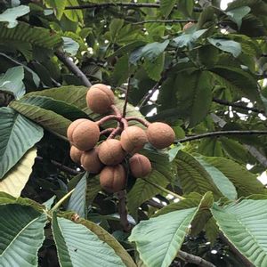 10m位の高〜い木🌳と実 連れが下から見上げて 「何の木かなぁ?」🤔と言うので オレンジ色っぽい実と長細い葉っぱが見え、実家にあった木と似てるので 「琵琶(ビワ)でしょ」🤭と決めつけましたが‥たわわな実をアップで見ると全然違いました😅 葉っぱもビワより葉脈がハッキリしていて広め。 この実「クルミ(胡桃)に似てるけど???」と思ったら、正解は「トチノキの実」でした‼️〜〜〜😳 小学校の時に習ったことを思い出します〜縄文時代のご先祖さまの貴重な食糧だった木の実🎶🌰アリガタヤ 手のひらのような葉っぱ、赤ちゃんをいっぱい抱えた母性を感じる木✨🤱✨肝っ玉母さん👶(o˘◡︎˘o)♪︎ 🏷️緑の赤ちゃん 🏷️らんまん応援♪