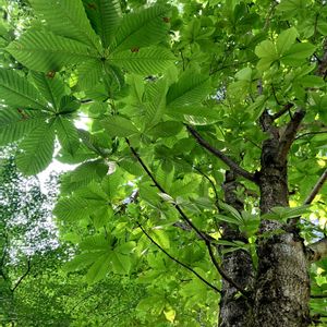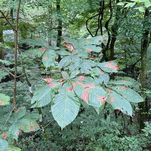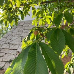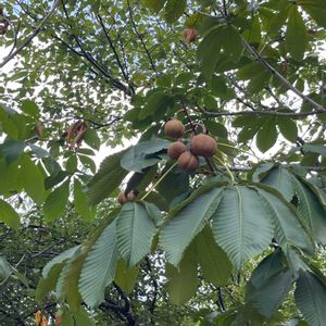 万能な植物🌿かな? "トチノキ" 大きくて美しい葉っぱに惹かれて近づいたら、可愛らしい茶色の実がい くつもついています🤎 トチノキの葉は天狗の団扇に例えられるほど立派です👺 表面は無毛で濃緑色、裏面は葉脈上に毛があり、葉の縁には鋸歯が見られます 秋には黄葉に変化し、これもまた美しいそうです🍂 花は見たことがないけど、ネット検索してみると初夏に華やかな白い花を咲かせます トチノキの種子「栃の実」は栗に似た丸い形と大きさです🌰 "とち餅」などの和菓子の原料になります 私の大好物🍡🍵 縄文時代から食べられてきた保存食ですが、タンニンやサポニンを多く含むため簡単に調理できるものでは無さそうです 木灰を用いた入念なあく抜きを施してから調理します 硬いので時間と労力のかかる工程を経るからこそ独特の風味と食感を味わえるんですね(感謝💓) ポリフェノールを含むので健康効果も期待できそうです 木の材は家具や工芸品に、花は蜜源 などとオールマイティの植物です🌲 ますます好きになったトチノキでした♪(๑ᴖ◡ᴖ๑)♪