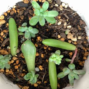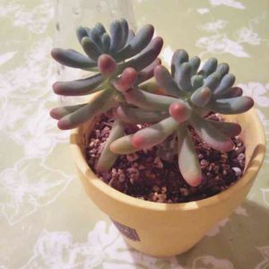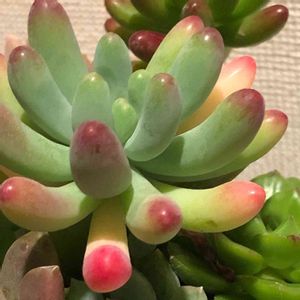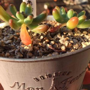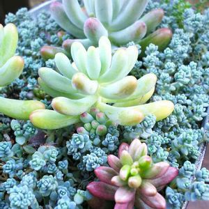 この手前のセダム? の子のお名前はなんでしょう? 購入時は、葉先が赤く 紅葉していました😊 虹の玉🌈と教えていただきました ありがとうございました😊