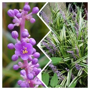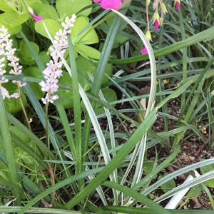 紫色の 小さな花を咲かせて 涼しそうで 強健な葉の 斑入りヤブラン 花言葉「隠された心」「忍耐」