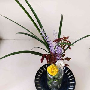 おはようございます。 昨日薔薇の弱剪定した時、見つけたヤブランの蕾と細ーい葉っぱ、グリーンアイスと、ピエールの芽、マリーゴールドで𓂃✿𓈒𓏸 今日も秋を感じて💛