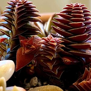 クラッスラ・茜の塔さんの横からのお姿。何処から魅ても不思議で面白い😊クラッスラ特有のステッチ模様も可愛い😆