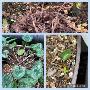 ↙️左下はこの形で夏越しした ガーデンシクラメンです。 上は別の株 動き出すかなぁ ↘️右下は、零れ種から 🐸11月になったら せっちゃんばぁばさんのみどりのまとめを見ながら 種蒔きしようと思っています。 ガーデンシクラメンは、シクラメンとはまた別ですね😅💦