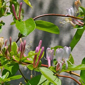 スイカズラ(忍冬) 挿し木から2年目 梅雨時にユニークな蕾が現れる♪ 別名 金銀花(キンギンカ) 咲き始めは白く次第に黄色に変化する