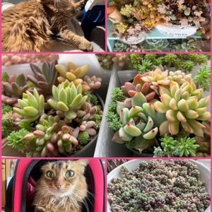 おはようございます☀ キョロ🐈に起こされて早朝の投稿で、ニャンニャン祭り🏷に参加します^ ^ ⬅️ ハンキングタイプの寄せ植え✨ ↙️ 去年か一昨年に100均アイテムで作った箱型鉢2つ🎶 適当に植えた多肉がこんなに大きく🤩 ➡️ 今日の主役のキョロ🐈はいつものようにソファーでラッコ🦦になったから、何かを持たせた😁 なにこれ??🪵?🐧❗️ by キョロ🐈🤣
