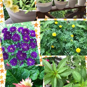 👆挿し芽育成中のカリブラコア 👈紫アスターとダイソーマリーゴールド咲いています🤗 👇葉っぱを野菜とよく間違えておひたしにしそうになるガーベラは、2度目の開花途中 ほうせんかも打ち上げ花火🎆みたいに大きくなりました😃。