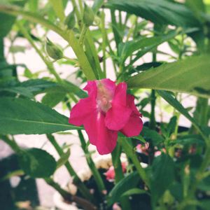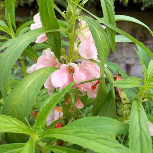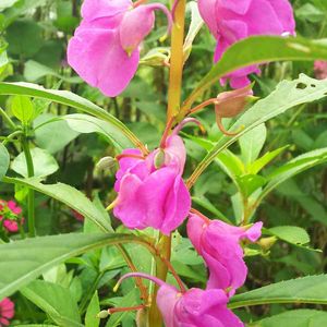 ホウセンカ(鳳仙花)です。 葉の縁がギザギザです。種ができかかってます。 子どもの頃 種が弾ける様子が面白くて よく触って遊んでました。