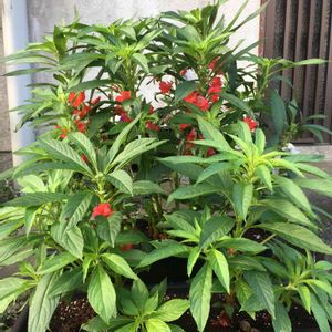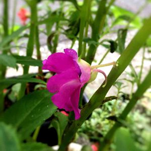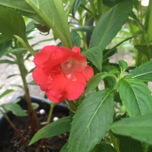 鳳仙花。 小ぶりですが、初の開花は朱いろから咲きました。 素敵ですね〜