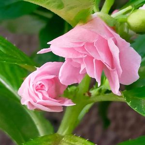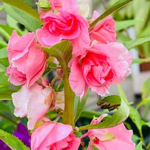 今日のお花 🌱ホウセンカ ツリフネソウ科 インパチェンス属 バラの花のようで可愛く咲いています! 孫が種蒔きから育てている鳳仙花(教材) 二種の花が良く咲いています