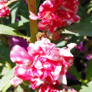 鳳仙花。 某所でたくさん咲いています 実が割れるのを小さい頃に 喜んで触ってました!