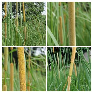 ガマです。 秋には太いフランクフルトのような穂を見た池です。 今の時期(6月)に行くことは今までありませんでした。 びっくりしました😳⚡💡 秋とは違う細めのフランクフルトが、なんと上と下に分かれています。 しかも、上のカタマリと、下のカタマリは、感じがちがいます。 左上の写真が、上下二段になっているところ。 右上の写真は下の段。細くて硬い感じ。 左下は上の段。花粉がべったりついています。指で触れたら黄色になってしまいました。 調べていませんが……上のが雄花かなと思いました。 この二段構えのがまは、ここに沢山あります。 でも、去年実った穂は5〜6個しかありませんでした(去年晩秋に見に行った時) 受粉しないと落ちてしまうのでしょうか? 今年は、どのくらい実るでしょうか? 右下の写真はどういう状態なのかしら? なんだか服を脱ぎかけているように見えます。 わかる方いらっしゃったら教えてください😊💖