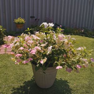 PW ラグランジア ブライダルシャワー🤍 白い装飾花が開きだして華やかになってきました✨ 日差しと暑さが心配な玄関横ですが、このサイズの鉢植えは他に置き場所がないので(株幅1m程)新しい場所を確保するまではここで頑張ってもらいます🌞 🏷PWブライダルシャワー成長記録