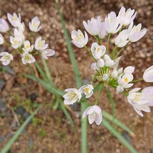 🤍ハタケニラ(畑韮) ヒガンバナ科 ハタケニラ属 葉は細長く扁平状 5~6月頃に小さな白い花を咲かせる。散形花序で5~10個前後を同時につける。花弁は6枚で主にツボミの時は赤みを帯びる事がある 開いた花弁の外側に褐色の筋が入る 本種は花からしゅしを形成する他に、地下茎に鱗茎を形成して繁殖するそうです