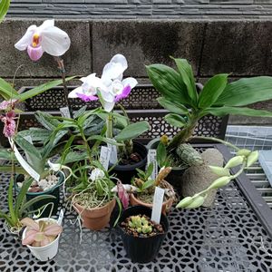 遅くなりましたが、サンシャインらん展での戦利品です! ①グリーンノートさんのパフィオ2点。左は冬に3℃に耐えたという寒さに強いデレナティー。うちちゃんとした加温設備ないから、寒さに強い子は買い!持って帰るうちにお花つぶれちゃった。ごめんよ💦でもいい香り💞 右はClair de Lune 'Edgard van Belle' AM/AOS 読めぬ。二鉢◯円って売ってたので、お友達と一鉢ずつ買ったのでした。これも強健!なはず。がんばって咲かせる。 ②左:デンドロビウム・パリシー・トリラベロ 右:Angcm.germinianum 幽霊っぽいの好き👻 ③左:トルムニア・ファンシー。お花の種類いろいろあって、その中から選びました。1000円。 右:二鉢◯円というぎゅうぎゅうに並んでたタケノコたちの中に、こんな大きな蕾を付けたピレアタム・アルバが!咲いてくれますように🙏 ④左:ガガイモさんです。黄色いお花が咲くらしい💛 右:ムシトリスミレ 翌朝見たら、虫だらけになってた😅 ⑤左:カトレア スノーブラインド。ワルケリアナとの交配種でとても強くていい香り!今回、この時期に咲いて香りのいいミニカトレアを買いたかったので、この子で大満足🎶 右:お友達にいただいたアフィラムの高芽たくさん。根っこがすでにとても長い!良いらしいと聞いた、「スリット鉢にベラボン」で植えたみた。 みんな元気に育っておくれ〜🤗