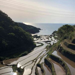 おはようございます☀ 連休中の思い出pic こちらも有名な棚田です。 「浜野浦の棚田」 棚田に水が引かれ 太陽の光が反射して とても綺麗でした。 今の時期は棚田から見える海に 夕日が沈むので たくさんの人が展望台で 陽が落ちるのを待ってました。 時間の都合で夕焼けは見れませんでした。