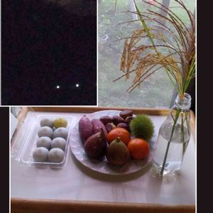 今日は十五夜ですね 即興で先日拾った栗🌰や、近所でもらった柿なんかをお供えして飾ってみました 何とか🌔も見えましたよ