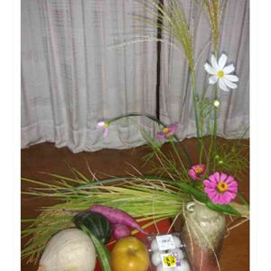 『秋の七草風 オバケカボチャ添え』 何がしたいか解りませんが、兎に角、秋の七草5種とその他2種。おまけでハロウィン添え。 今日は十五夜だ!ボウジボウ振り回して子供らがお金せびりに練り歩くぞ!ある意味日本版ハロウィンだね。 『お菓子くれなきゃ…じゃなくて、お金頂戴!豊作祈ってあげるから的な』
