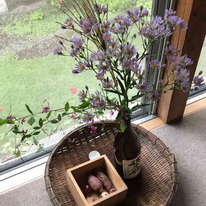こんばんは😊 今日は中秋の名月ですね🎑 残念ながら宮崎では見られそうもないです😭 一応、お供えはしてみました🤲 ススキ、シオン、萩の花🌸 里芋、さつまいも🍠、栗🌰、お神酒🍶です お団子はありません💦 ちょっと寂しいかな😓